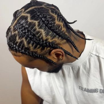 Fokus auf saubere Cornrows und Design-Braids wie Straight Backs, Stitch Braids, Zickzack-/Muster-Flechtungen sowie Two-Strand Twists. Ideal für einen cleanen, sportlichen Style, der lange hält und im Alltag wenig Aufwand braucht.